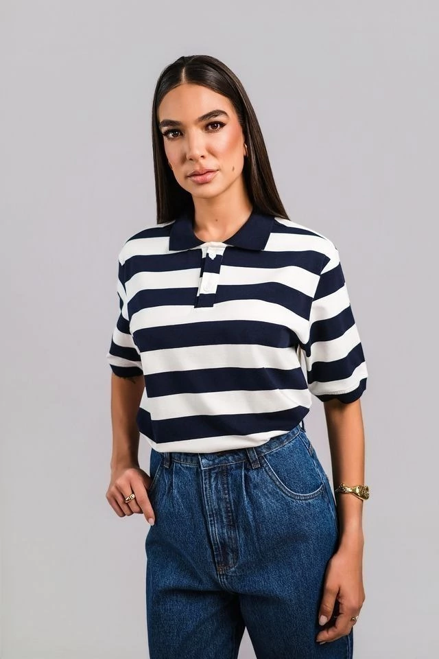 Expedição Letslo: A Camisa Polo Ariel é a escolha perfeita para quem ama unir conforto e elegância em um look casual. Com listras horizontais em azul marinho e branco, traz um ar náutico atemporal que nunca sai de moda. Seu corte levemente oversized garante um visual moderno e descomplicado.