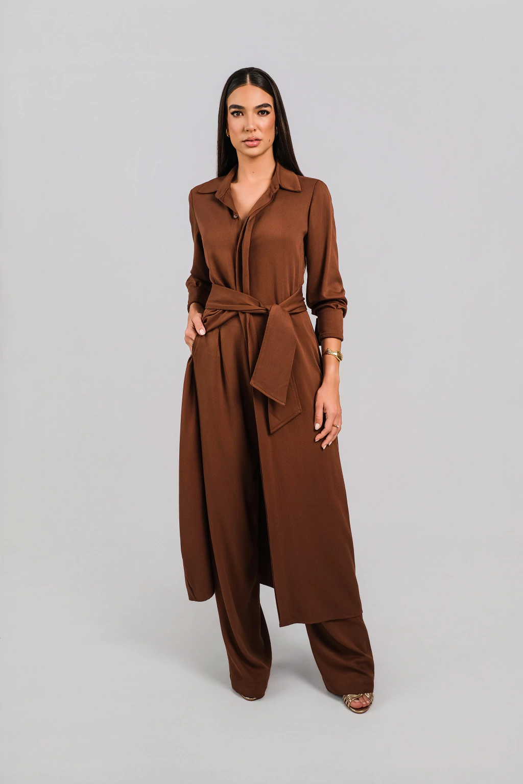 O tecido leve proporciona conforto e movimento, enquanto o tom marrom transmite sofisticação e versatilidade — ideal para produções que vão do dia ao noite.