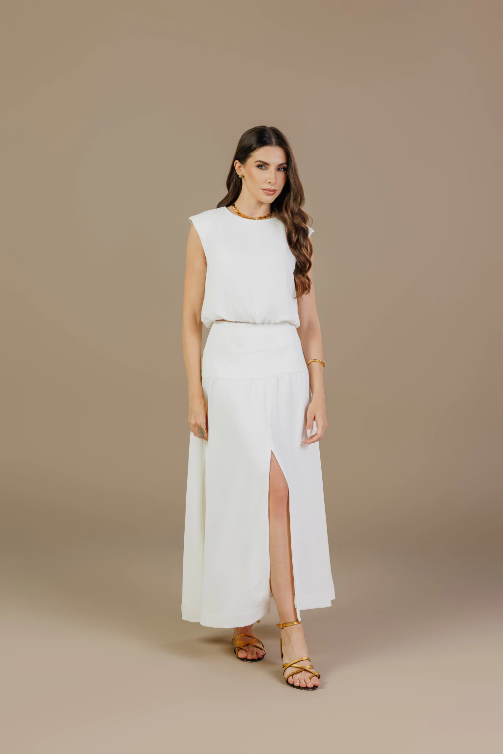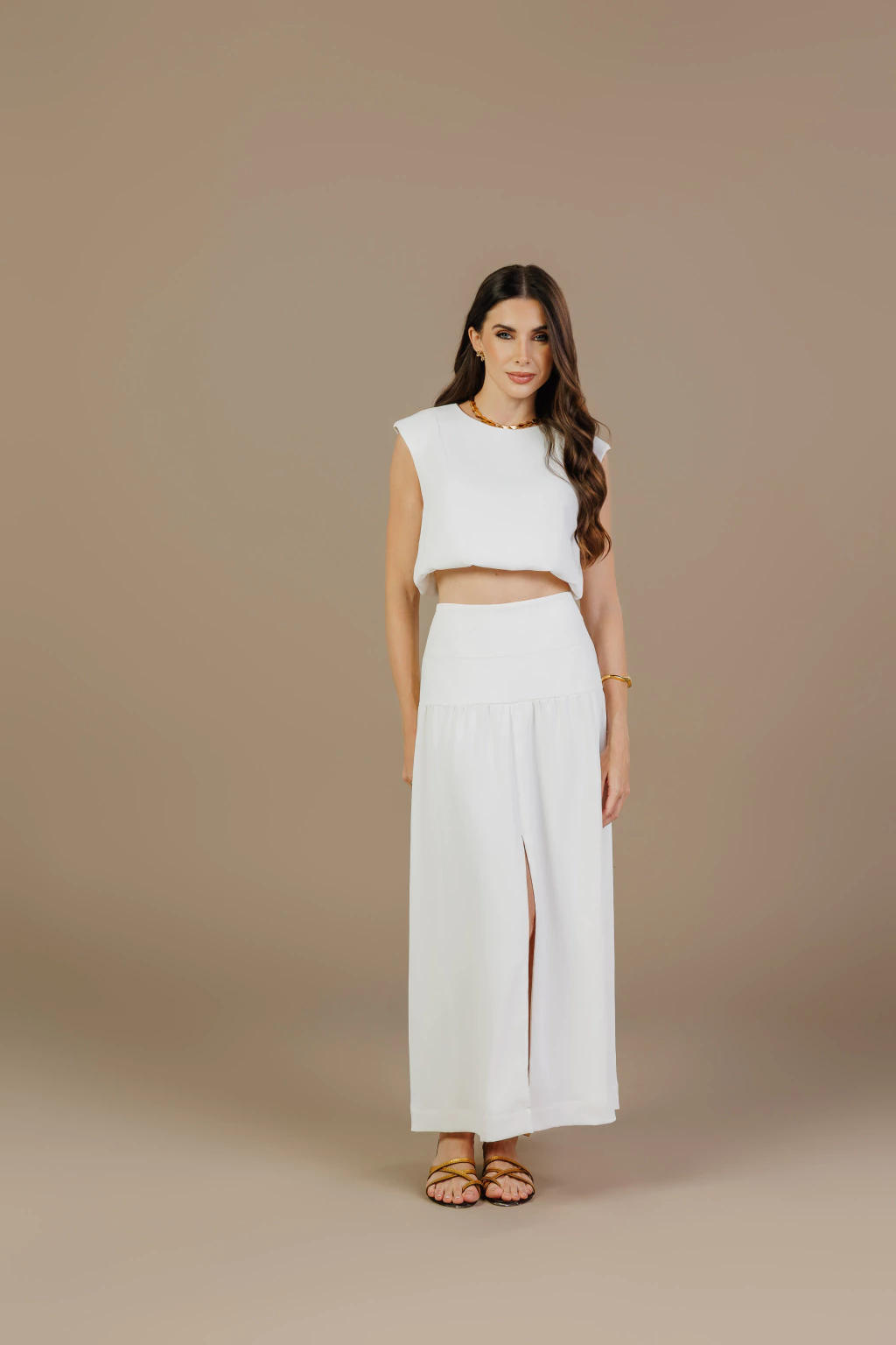 A blusa cropped possui modelagem reta e ombros estruturados, garantindo um toque contemporâneo ao look. Já a saia longa apresenta cós alto que define a cintura e fenda frontal que adiciona movimento e sensualidade na medida certa.
