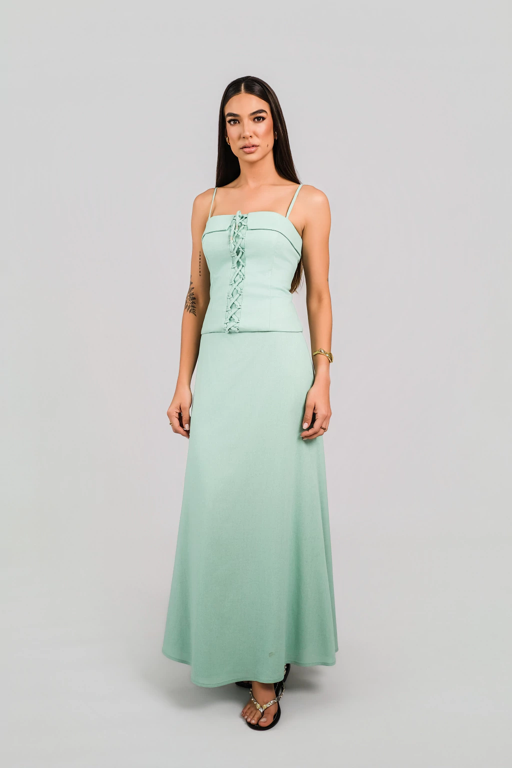 O comprimento midi alonga a silhueta, enquanto a cintura alta traz definição e modernidade ao visual. Em tom amarelo claro, é uma peça que transmite feminilidade e leveza — perfeita para mulheres que desejam se destacar de forma autêntica e refinada.