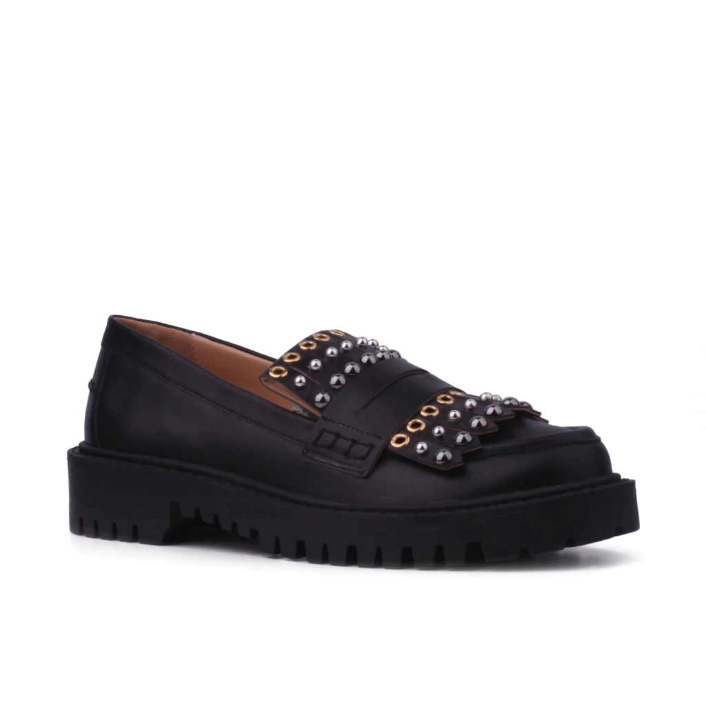 Ultra chic e um tanto quanto preppy, o mocassim é o grande hit do Inverno. No couro no tom preto, ele reafirma a tendência com traços de praticidade, tradição despretensiosa e design moderno. O modelo possui detalhe de franjas com aplicações de rebites circulares, bico redondo e solado plataforma tratorado.